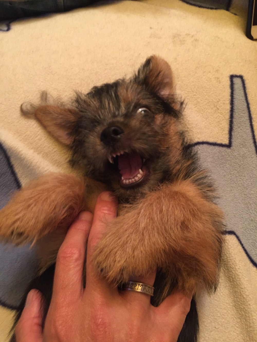 What a fright I had on the first night here! I was so pooped I couldn’t keep my eyes open, so I burrowed under the comfiest pillow ever on the massive-est bed I ever saw and slept whilst they watched flashing pictures and there was music and lots of voices. Next thing I know, I’m in my own bed in the room nearby where they seem to do their washy-cleany things before bed. The light goes out and off they go, pulling the door behind them, and – oh, suddenly I’m on my OWN. In the DARK. No way!
